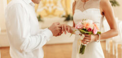 The groom puts a golden ring on the bride’s finger. Wedding ceremony
