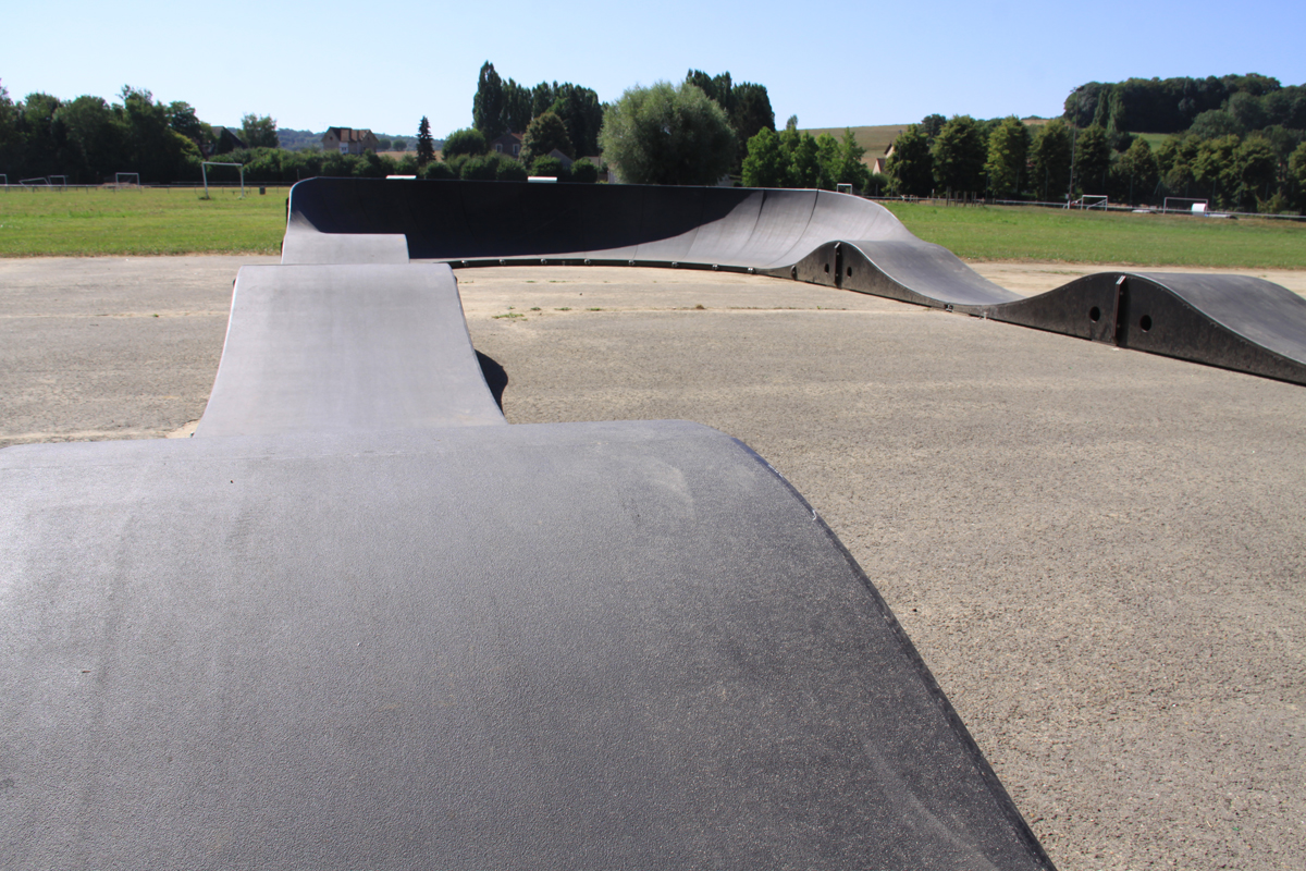 Toute en bois traité et fibre de verre, la piste de 44 mètres accueille les fans de VTT, BMX, trottinette, skate ou rollers.